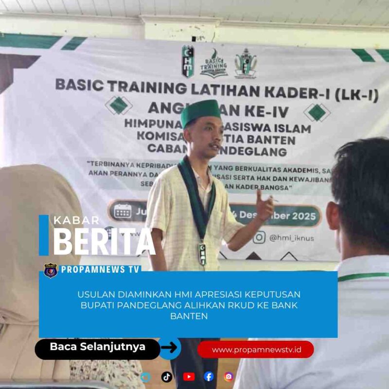 Pandeglang //propamnewstv.id – Himpunan Mahasiswa Islam (HMI) Cabang Pandeglang menyampaikan apresiasi kepada Bupati Pandeglang atas keputusan Pemerintah Kabupaten Pandeglang yang secara resmi mengalihkan Rekening Kas Umum Daerah (RKUD) ke Bank Banten efektif mulai 1 Januari 2026.