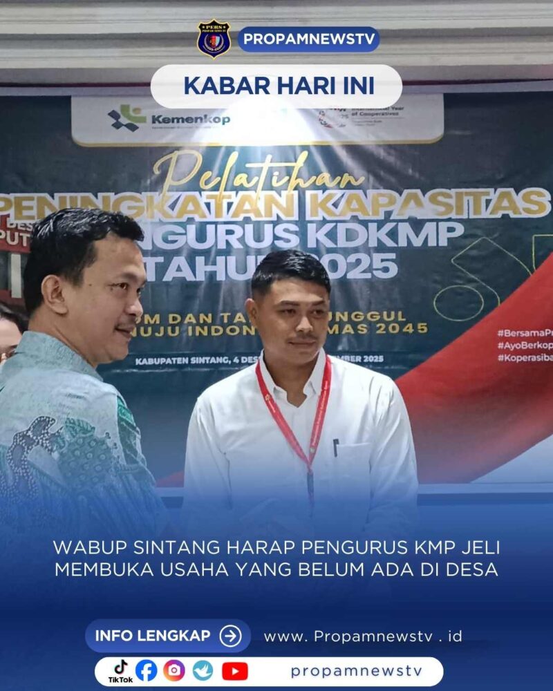 SINTANG//propamnewstv.id – Wakil Bupati Sintang Florensius Ronny membuka Pelatihan Sumber Daya Manusia Pengurus Koperasi Desa/Kelurahan Merah Putih Se Kabupaten Sintang Angakatan VIII yang merupakan angkatan terakhir di Aula CU Keling Kumang pada Kamis, 4 Desember 2025.