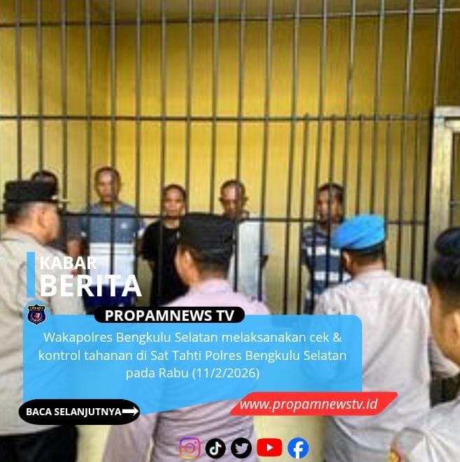 Wakapolres Bengkulu Selatan, // PropamNewstv.id – melaksanakan cek & kontrol tahanan di Sat Tahti Polres Bengkulu Selatan pada Rabu (11/2/2026) pukul 07:45 Wib s/d Selesai. Kegiatan ini merupakan bagian dari upaya memastikan kondisi tahanan aman, terkendali, dan sesuai dengan prosedur yang berlaku.