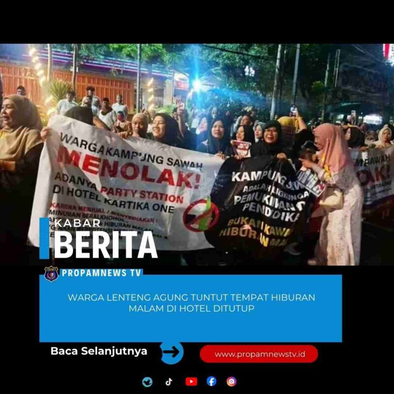 Jakarta, // PropamNewstv.id – Sejumlah warga menggelar aksi penolakan tempat hiburan malam di hotel kawasan Lenteng Agung, Jagakarsa, Jakarta Selatan (Jaksel). Polisi mengarahkan manajemen dan warga melakukan mediasi untuk mencari solusi.