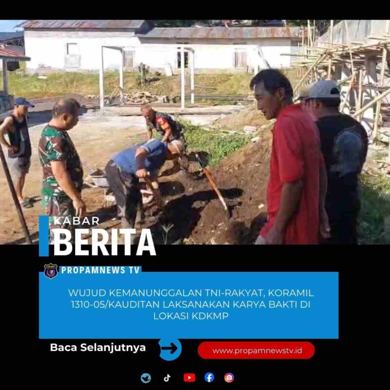 MINAHASA UTARA, // PropamNewstv.id – Anggota Kodim 1310/Bitung bersama perangkat Desa Kauditan Dua melaksanakan kegiatan Karya Bakti pembersihan lahan pembangunan di lokasi Koperasi Desa/Kelurahan Merah Putih (KDKMP) yang bertempat di Desa Kauditan Dua Kec. Kauditan Kab. Minahasa Utara, Kamis (15/1/2026).