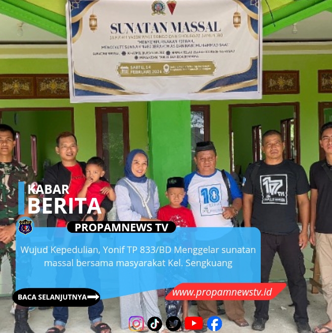 Sanggau, // PropamNewstv – Dalam upaya memperkuat kemanunggalan TNI dengan rakyat, Batalyon Infanteri TP 833/Bumi Daranante bersinergi dengan Jama’ah Yasin Wali Songo dan Sholawat Jamuniro menggelar aksi sosial terpadu di Gedung Majelis Ta’lim, Kelurahan Sengkuang, Sanggau, Sabtu (14/02/2026).