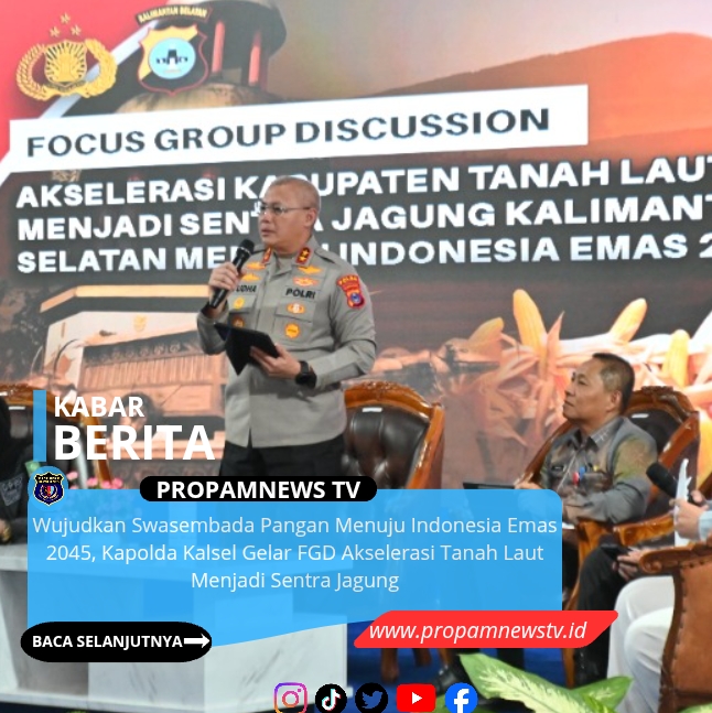 Kepala Kepolisian Kalsel,  // PropamNewstv.id – Irjen Pol Dr. Rosyanto Yudha Hermawan, S.I.K., S.H., M.H., memimpin langsung jalannya Focus Group Discussion (FGD) bertajuk “Akselerasi Kabupaten Tanah Laut Menjadi Sentra Jagung Kalsel Menuju Indonesia Emas 2045”. Kegiatan yang berlangsung di Balairung Tuntung Pandang, Kabupaten Tanah Laut, Jumat (20/2/2026) pukul 09.00 WITA ini dihadiri oleh puluhan Penyuluh Pertanian Lapangan (PPL) se-Kabupaten Tanah Laut serta Bhabinkamtibmas jajaran Polres Tanah Laut.