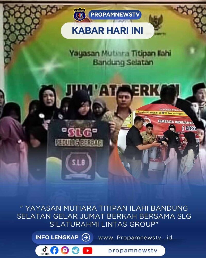 Banjaran // propamnewstv.id – Yayasan Mutiara Titipan Ilahi Bandung Selatan bekerja sama dengan SLG Silaturahmi Lintas Group menggelar kegiatan Jumat Berkah yang bertujuan untuk memberikan kebahagiaan dan bantuan kepada anak-anak yatim dan dhuafa. Acara ini berlangsung di Komplek Grya Permata Indah Blok E2 No. 16B, Desa Sindangpanon, Kecamatan Banjaran, Provinsi Jawa Barat dan dihadiri oleh pengurus yayasan, relawan dari berbagai group dalam SLG, serta puluhan anak-anak yang menerima bantuan. Antara lain yang hadir adalah Alfien Adam (pembina Sakura), Ibu Titin Suhartini (ketua Sakura), dan H. Nana Rohmana (ketua SZN Zensasi Zaman Now), Sabtu 06/12/2025.