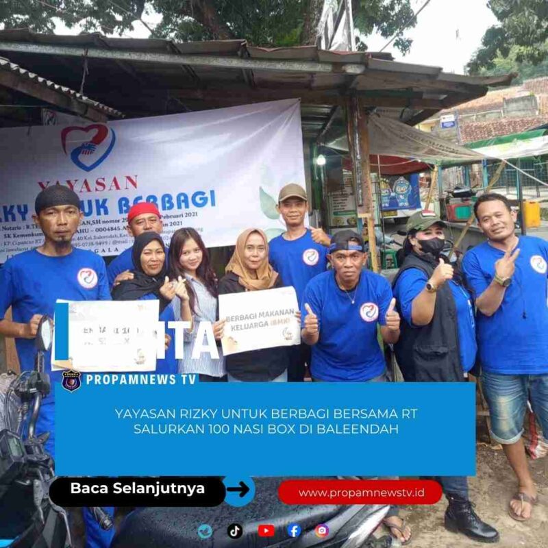 BANDUNG, // PropamNewstv.id — Yayasan Rizky Untuk Berbagi bersama RT setempat menggelar kegiatan sosial dengan menyalurkan 100 nasi box kepada fakir miskin, mualaf, musafir, serta anak yatim piatu. Kegiatan tersebut dilaksanakan di Jl. Kiastramanggala No. 11, Baleendah, Kabupaten Bandung.